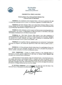 President Simina Proclaims National Public Defender Day in the Federated States of Micronesia